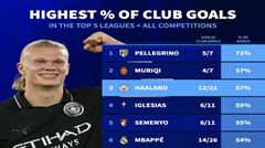 Haaland ghi 57% bàn thắng của Man City, đứng thứ hai trong 5 giải hàng đầu châu ÂuHaaland